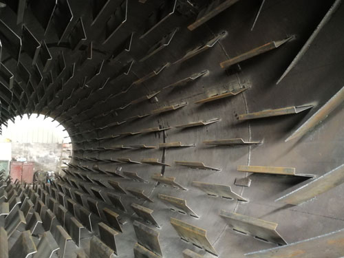 要想將干粉砂漿烘干到合理的水分,烘干機的安裝工藝和設計工藝非常重要,由于粉狀物料流動性不如固體物料,干粉砂漿烘干機的安裝需要設計一個合理的傾斜角度,能讓物料在被烘干的過程中勻速流動,這個流速需要達到剛好物料到出口處時被烘干,所以傾斜角度的設計很重要。然后是設計工藝,粉狀物料會由于重力的作用沉積,要想充分將其烘干,必須進行打散揚起,讓高溫氣流從物料種穿過,這就對筒體內(nèi)的設計工藝提出要求,除了安裝揚料板,還要對排布位置,間距、密度等參數(shù)有一個合理的設計。
